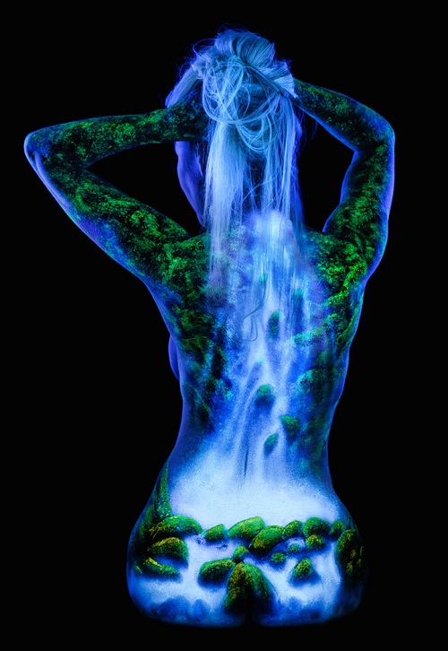 Bộ sưu tập "Black Light Bodyscapes" bao gồm nhiều bức vẽ phong cảnh bằng màu phản quang trên lưng của mẫu nữ. |