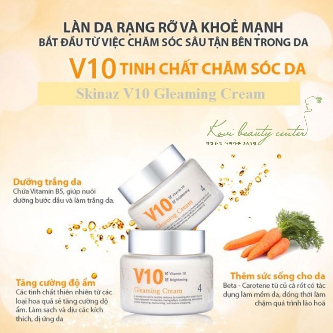Kem dưỡng da V10 Gleaming là dòng sản phẩm được bào chế nhằm giúp phái đẹp duy trì được một làn da trắng sáng mịn màng, căng mịn. Đặc biệt đối với thời tiết thất thường như tại Việt Nam, việc duy trì độ ẩm cho da là cực kỳ quan trọng. Sử dụng kem dưỡng da Skinaz thường xuyên và đúng cách sẽ giúp bạn sở hữu làn da đẹp như mong đợi.