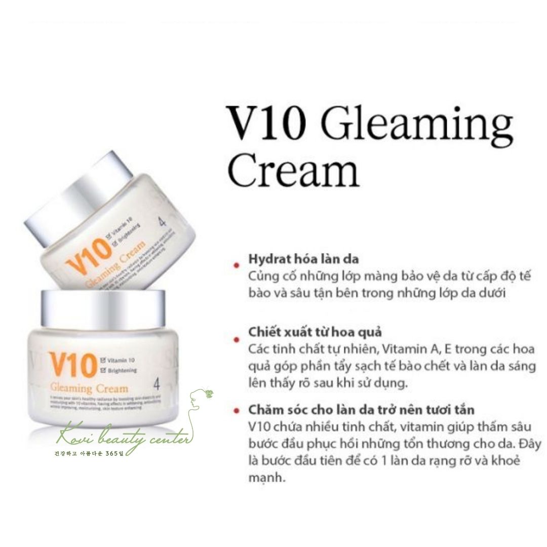 Với hàm lượng giàu các loại vitamin nhóm B, C, A, sử dụng kem dưỡng da V10 Gleaming chính là cách đơn giản giúp phụ nữ loại bỏ đi làn da bị sạm đen do cháy nắng, đặc biệt là với những ai thường xuyên phải di chuyển trong thời tiết nắng nóng.