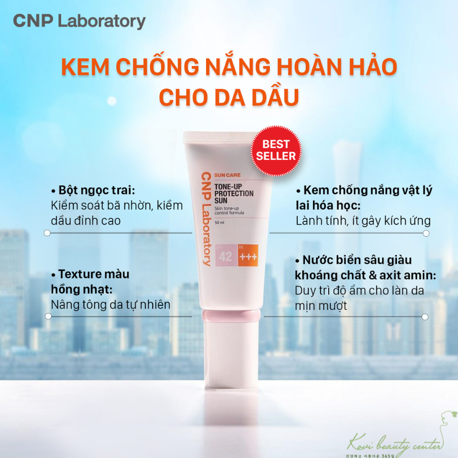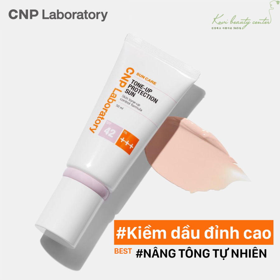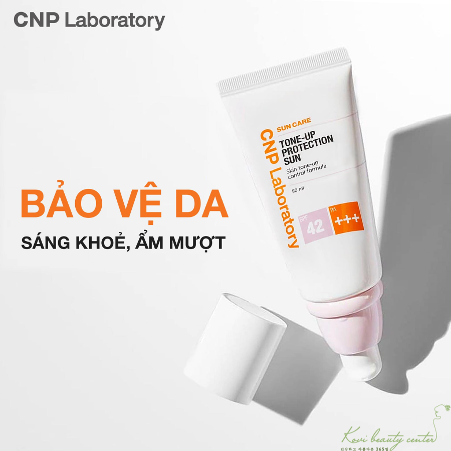 - Kem chống nắng CNP Laboratory Tone-Up Protection Sun SPF42/PA+++ bảo vệ da khỏi tác động xấu của tai UVA/UVB, đồng thời sản phẩm có khả năng nâng tông da một cách tự nhiên, hồng hào.