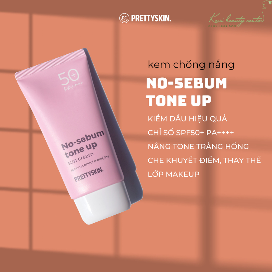 • Kem chống nắng No- sebum Tone up giúp sáng da, kiềm dầu nhờ công thức độc quyền từ Prettyskin cho nàng da dầu mụn thỏa sức vui chơi mà không lo bóng dầu hay xuống tone