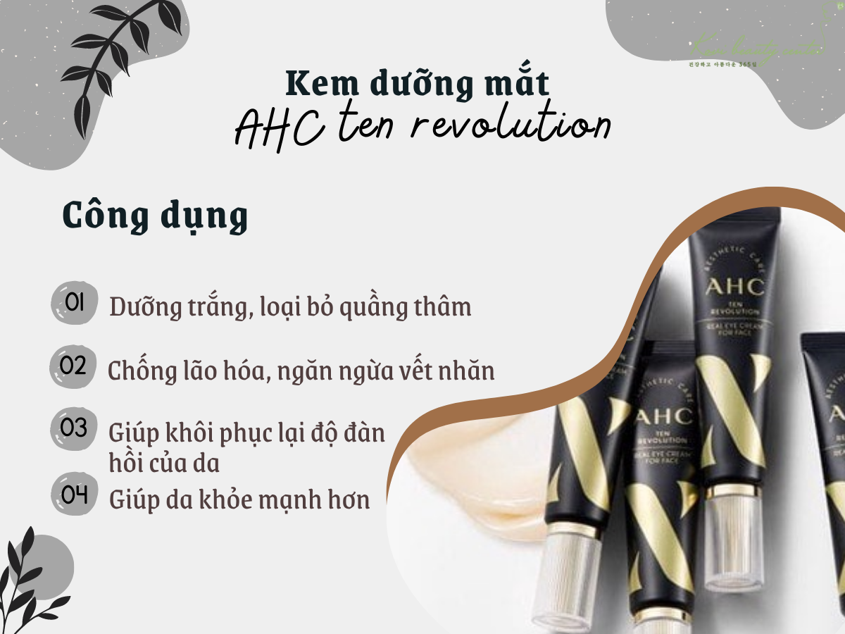 - Kem Dưỡng Trắng, Chống Lão Hóa Vùng Mắt Ahc Ten Revolution Real Eye Cream For Face (Màu đen) - Mẫu mới nhất vừa ra mắt năm nay - 2022, phiên bản số 10 được cải tiến đỉnh của chóp, thiết kế đen sang chảnh, chức năng chính vẫn là dưỡng trắng, loại bỏ quầng thâm và chống lão hóa, ngăn ngừa vết nhăn cho vùng mắt nhưng có bổ sung thêm một vài thành phần để tăng hiệu quả hơn.