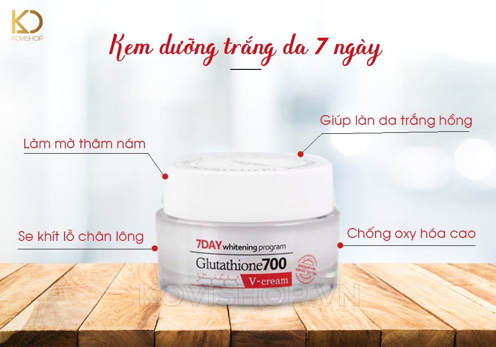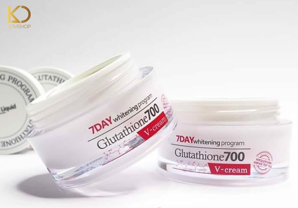 - Vào buổi tối, sau khi tẩy trang bằng các loại nước tảy trang thì đợi da khô rồi dùng kem 7 Day Whitening Program Glutathione 700 V-Cream chấm lên các điểm của khuôn mặt rồi dùng ngón tay thoa đều và massage chừng 3 phút để dung dịch thẩm thấu sâu