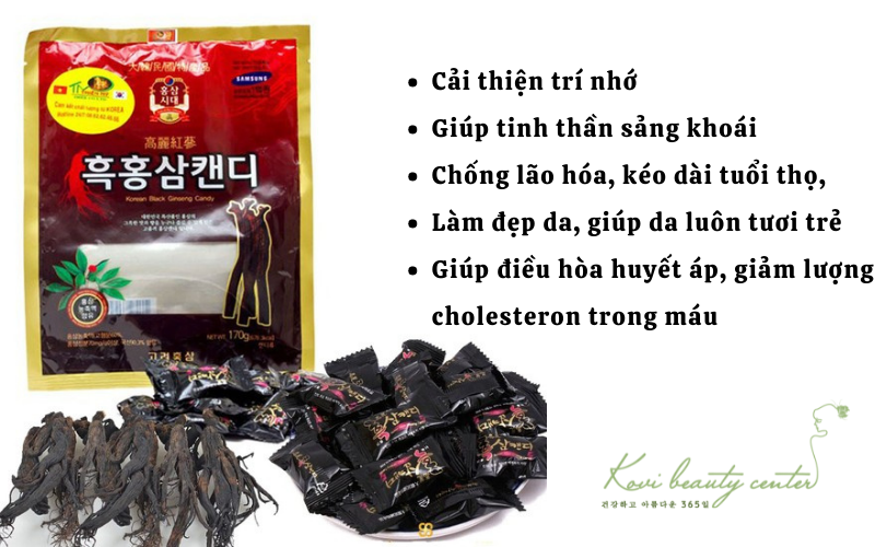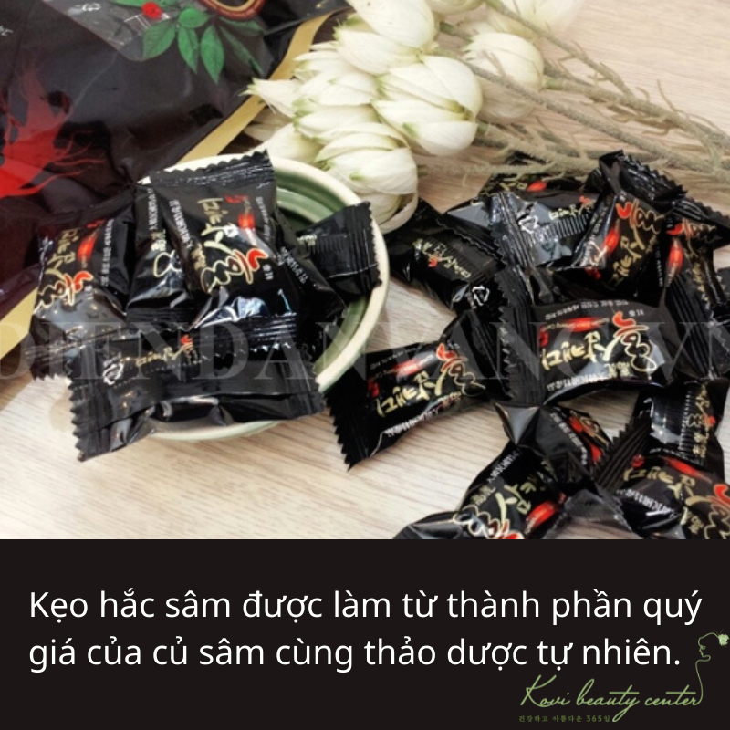 - Thời hạn sử dụng, ngày sản xuất in trên bao bì sản phẩm. Chất liệu bao bì và quy cách đóng gói kẹo hắc sâm Hàn Quốc đóng trong túi PE và đạt tiêu chuẩn vệ sinh an toàn thực phẩm.