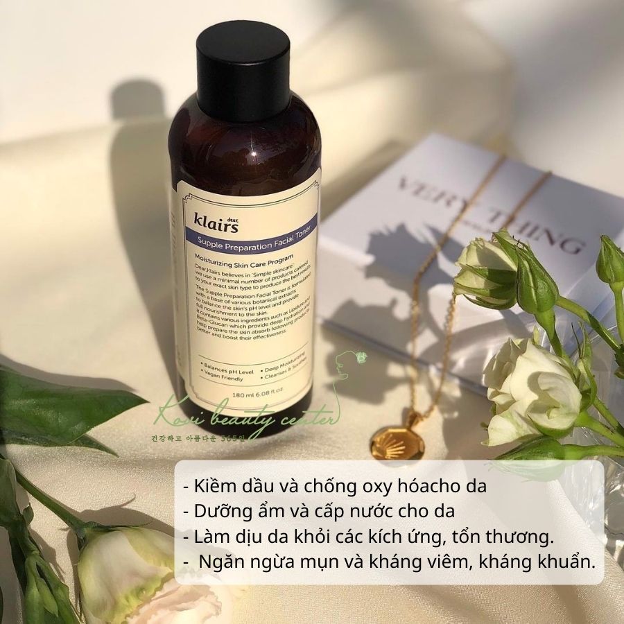 - Nước Hoa Hồng Có Mùi Dear Klairs Dưỡng Ẩm Da Và Làm Mềm Da Supple Preparation Facial 180ml có chiết xuất từ thực vật, giúp cân bằng độ pH, tăng cường hiệu quả chăm sóc da, giúp "hồi sức" và "bừng tỉnh" làn da mềm mại, ẩm mịn, sáng ngời. Toner có dạng trong suốt, không màu, lỏng, nhẹ, hơi nhớt, thấm rất nhanh trên da. Sản phẩm giúp loại bỏ bụi bẩn và bã nhờn dư thừa trên da sau khi rửa mặt đồng thời cân bằng độ pH để các bước skincare tiếp theo đạt hiệu quả hơn.