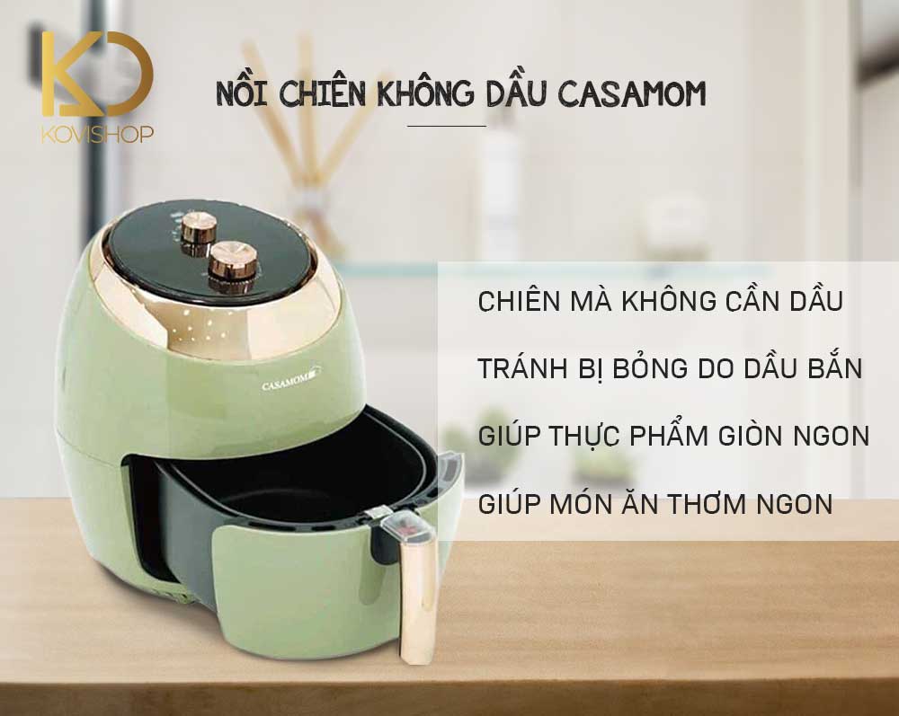 - Công nghệ chiên không dầu Casamom cho phép bạn chiên rán, nướng và quay thực phẩm nhanh chóng mà không cần hoặc dùng rất ít dầu ăn. Bởi vậy bạn có thể thoải mái ăn các món chiên rán mà vẫn giữ được vóc dáng và không ảnh hướng đến sức khỏe.