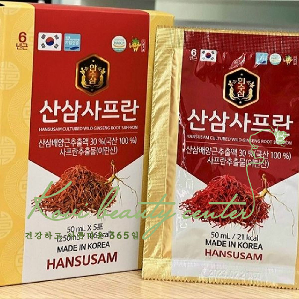 - Thành phần nguyên liệu sản phẩm: Chiết xuất hỗn hợp thảo mộc (nước tinh khiết, táo đỏ, rễ sắn dây rừng, cây nhân trần hao, rễ cây bạch chỉ, thân rễ giần sàng, vỏ quýt, rễ địa hoàng, nấm linh chi, cam thảo, quế), chiết xuất từ rễ nhân sâm núi được nuôi cấy (hàm lượng rắn 0.3%) chiếm 30%, fructose lỏng, chiết xuất Saffron, xi rô đường, hương liệu tổng hợp (hương thảo mộc), chất điều chỉnh độ acid citric INS330, taurine.