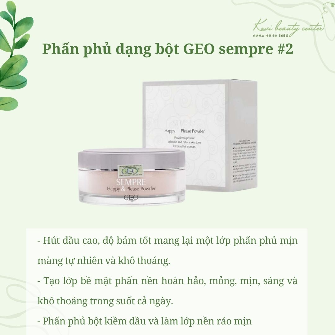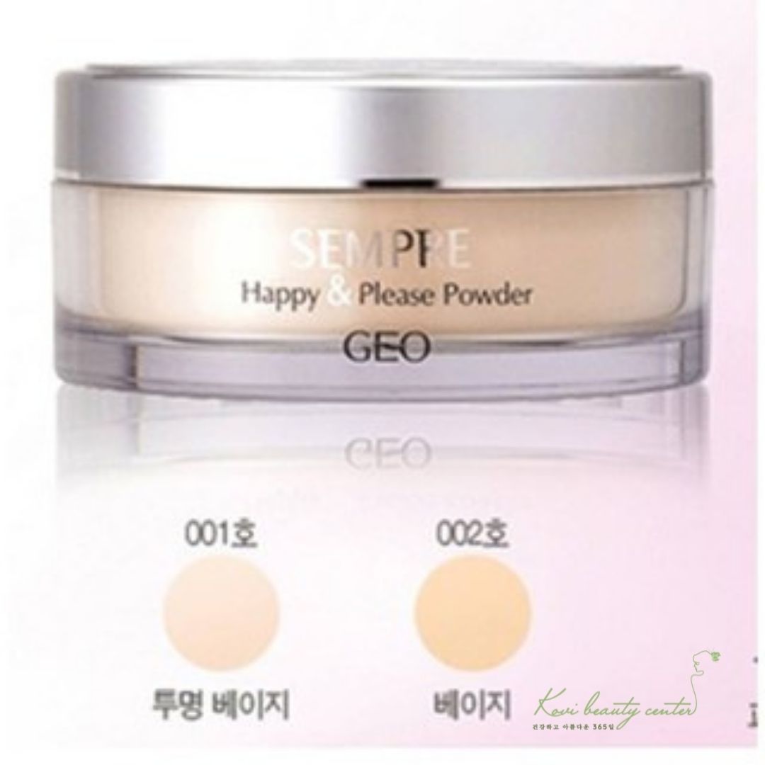 - Phấn Phủ Bột Geo Sempre chứa tinh chất từ nước biển, cây xương rồng, hoa trà và rau câu biển, ngọc trai. Với kiểu dáng sang trọng, Phấn Phủ Bột Geo Sempre Happy & Please Powder được tạo thành từ các hạt phấn bột rỗng dưới dạng bột, có tác dụng 2 trong 1, chức năng hút dầu cao, độ bám tốt mang lại một lớp phấn phủ mịn màng tự nhiên và khô thoáng tạo nên một lớp bao phủ phía ngoài, trơn nhẵn mượt mà, làm bụi khó bám hơn so với da bình thường. Bảo vệ da với chỉ số chống nắng SPF 20+.
