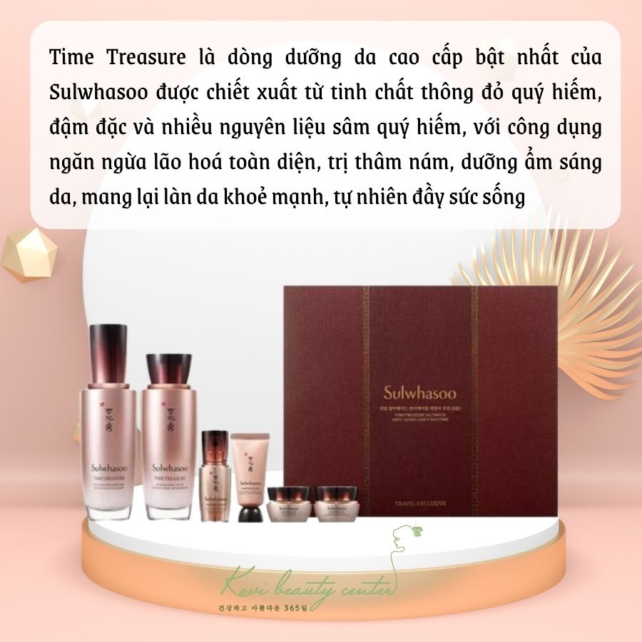 - Time Treasure là dòng dưỡng da cao cấp bật nhất của Sulwhasoo được chiết xuất từ tinh chất thông đỏ quý hiếm, đậm đặc và nhiều nguyên liệu sâm quý hiếm, với công dụng ngăn ngừa lão hoá toàn diện, trị thâm nám, dưỡng ẩm sáng da, mang lại làn da khoẻ mạnh, tự nhiên đầy sức sống