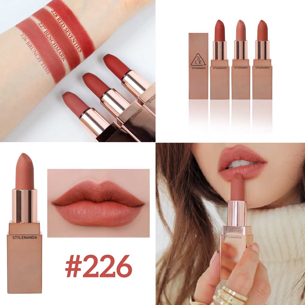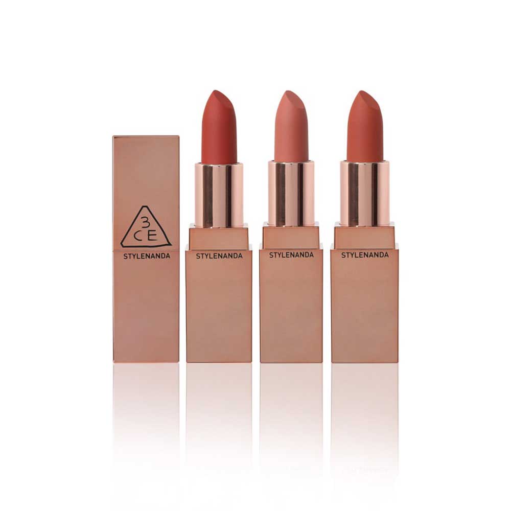 - 3CE Matte Lip Color là dạng son lì nhưng kết cấu gần như kem, mềm mịn như một lớp nhưng lụa, giữ cho lớp son trên môi bền bỉ suốt cả ngày dài và giữ màu bám siêu lâu.