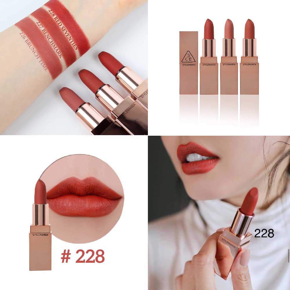 - 3CE Matte Lip Color là dạng son lì nhưng kết cấu gần như kem, mềm mịn như một lớp nhưng lụa, giữ cho lớp son trên môi bền bỉ suốt cả ngày dài và giữ màu bám siêu lâu.
