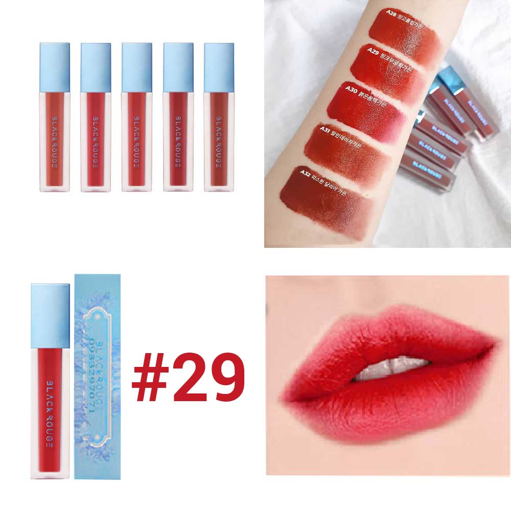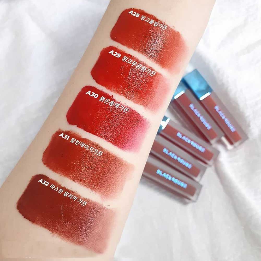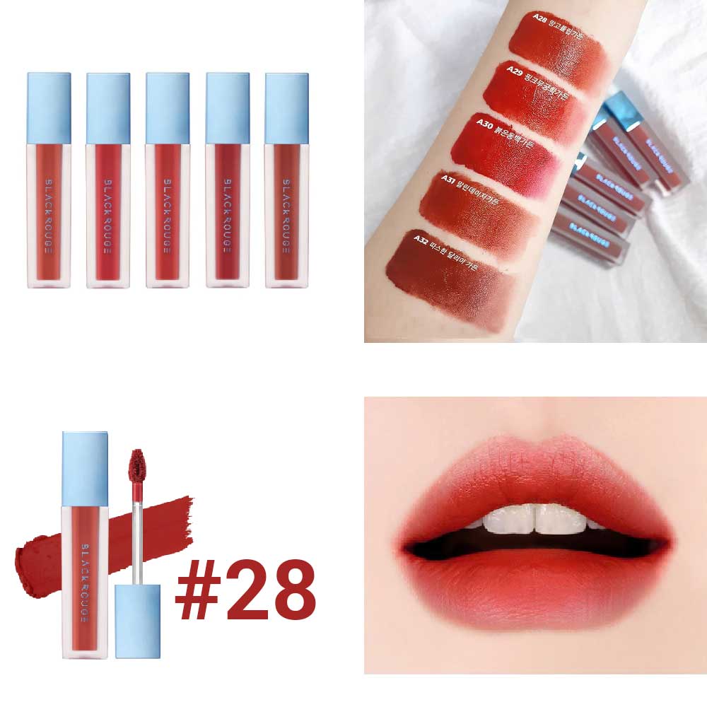 - Màu son trong tiên trong Black Rouge version 6 là màu đỏ cam ánh vàng lấy cảm hứng từ những cánh hoa tulip đằm thắm nhưng không kém phần rạng rỡ. Tỷ lệ màu đỏ có một chút vượt trội hơn sắc cảm và vàng nên sẽ không làm cho làn môi quá chói lóa. Tuy vậy, bạn nên lưu ý màu da của mình trước khi lựa chọn màu A28 này vì chúng có thể làm xỉn màu da và men răng nếu không phù hợp.