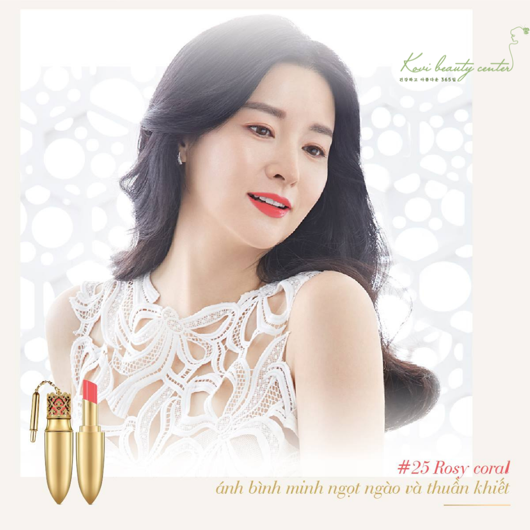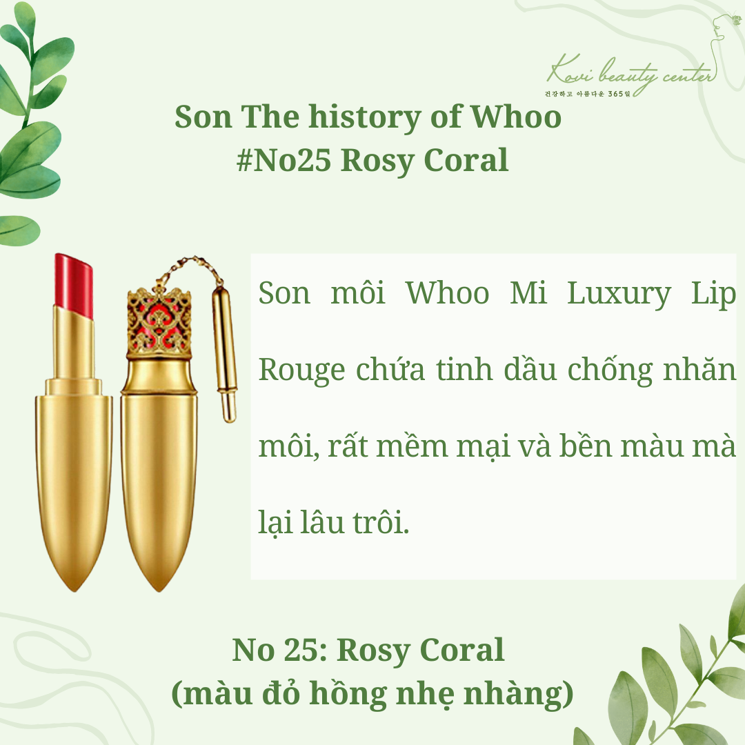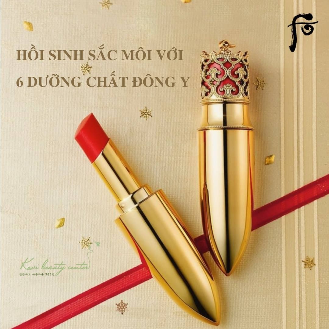 – Son môi cao cấp của Whoo chứa các thành phần quý hiếm của hoàng cung như đá ruby, ngọc trai, san hô, … kết hợp hoa sen, hoa bí, … cũng như quế, hổ phách, … giúp người dùng thêm phần quý phái.