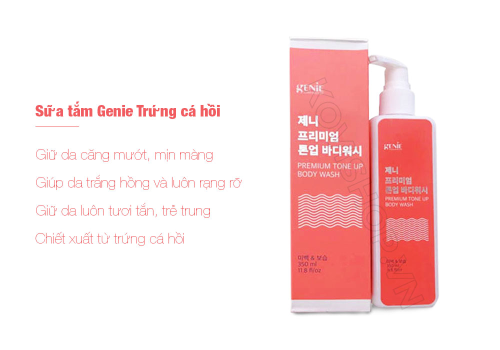 - Sữa tắm Genie Premium Tone Up được công nhận về độ lành tính, với chiết xuất từ trứng cá hồi và các thành phần tự nhiên có thể sử dụng cho cả làn da nhạy cảm của mẹ bầu