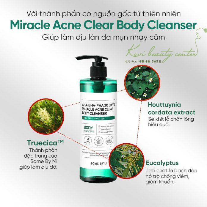 - Sữa Tắm trị mụn Some By Mi AHA-BHA-PHA 30 Days Miracle Acne Body Cleanser giúp loại bỏ mụn lưng nhờ vào cơ chế loại bỏ đi lượng bã nhờn dư thừa trên da, đồng thời loại bỏ tế bào chết cũng như tạp chất giúp thông thoáng lỗ chân lông giảm đi tình trạng mụn lưng một cách rõ rệt cũng như giảm đi các vấn đề mụn sưng tấy ở lưng và ngực.
