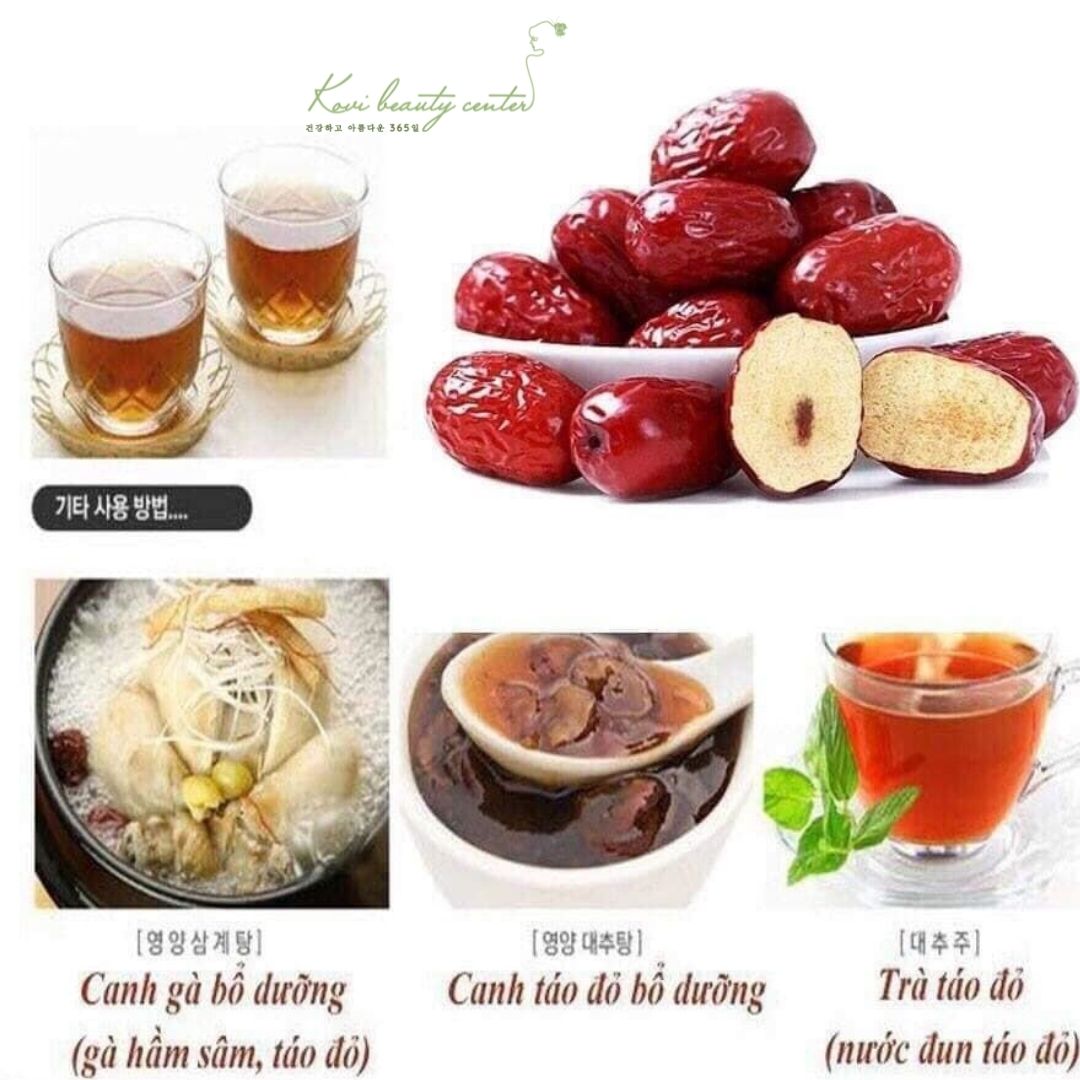 - Táo đỏ có thể ăn liền, nấu chè hoặc hầm với nhân sâm Hàn Quốc, hay nấu canh gà kì tử đẳng sâm i dĩ rong biển, canh chân giò hầm với kì tử long nhãn v.v…..
