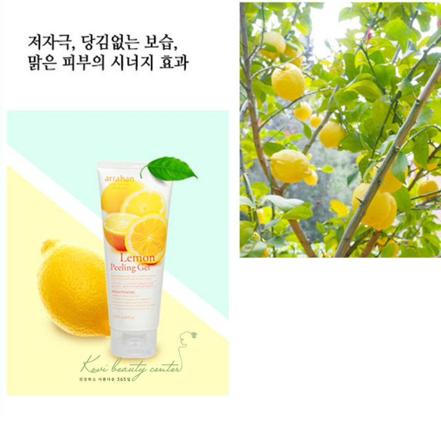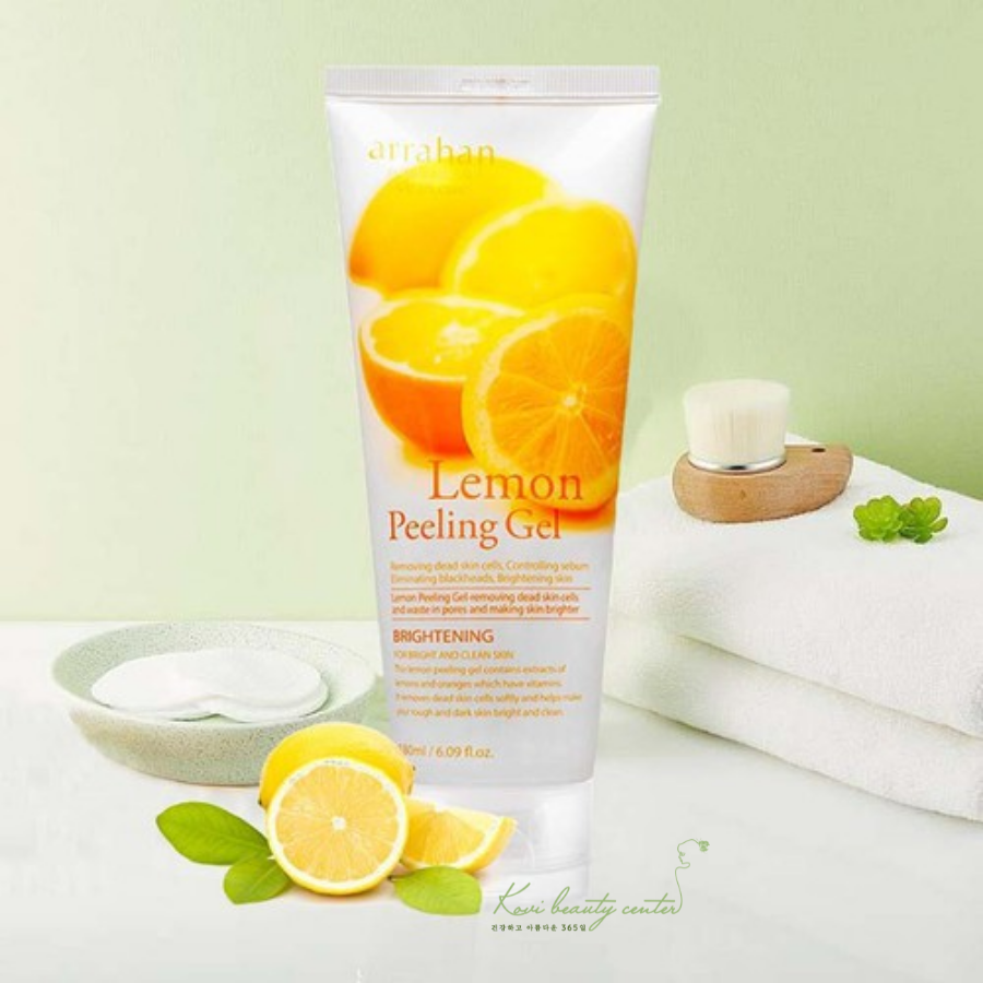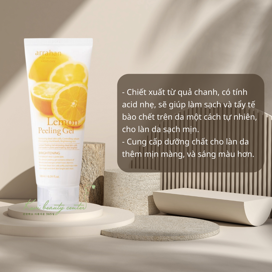 - Gel Tẩy Tế Bào Chết Arrahan Hương Chanh Lemon Peeling Gel 180ml với chiết xuất từ quả chanh có tính acid nhẹ giúp làm sạch da khỏi tế bào da chết trên da, giúp da trắng sáng, hồng hào, cấp độ ẩm cho da. Các vitamin trong chanh, nhất là Vitamin C sẽ cung cấp dưỡng chất cho làn da thêm mịn màng, tươi sáng và hương chanh thiên nhiên cho cảm giác tươi mát, dễ chịu khi dùng.