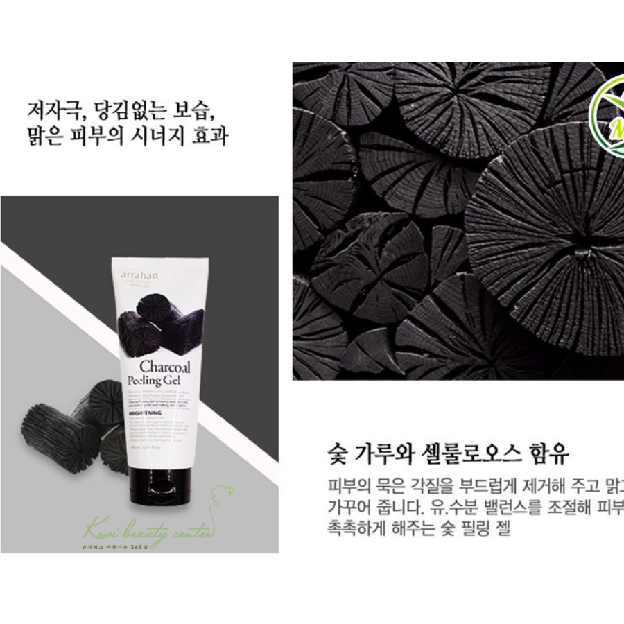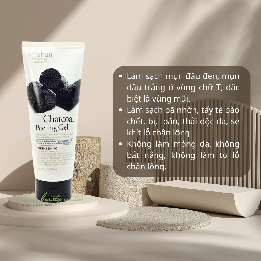 - Gel tẩy Tế Bào Da Chết Chiết Xuất Từ Than Hoạt Tính ARRAHAN CHARCOAL PEELING GEL có Kết cấu dạng gel với thành phần chính là bột than hoạt tính có khả năng loại bỏ tế bào chết một cách hiệu quả đồng thời làm sạch bã nhờn, bụi bẩn, thải độc cho da