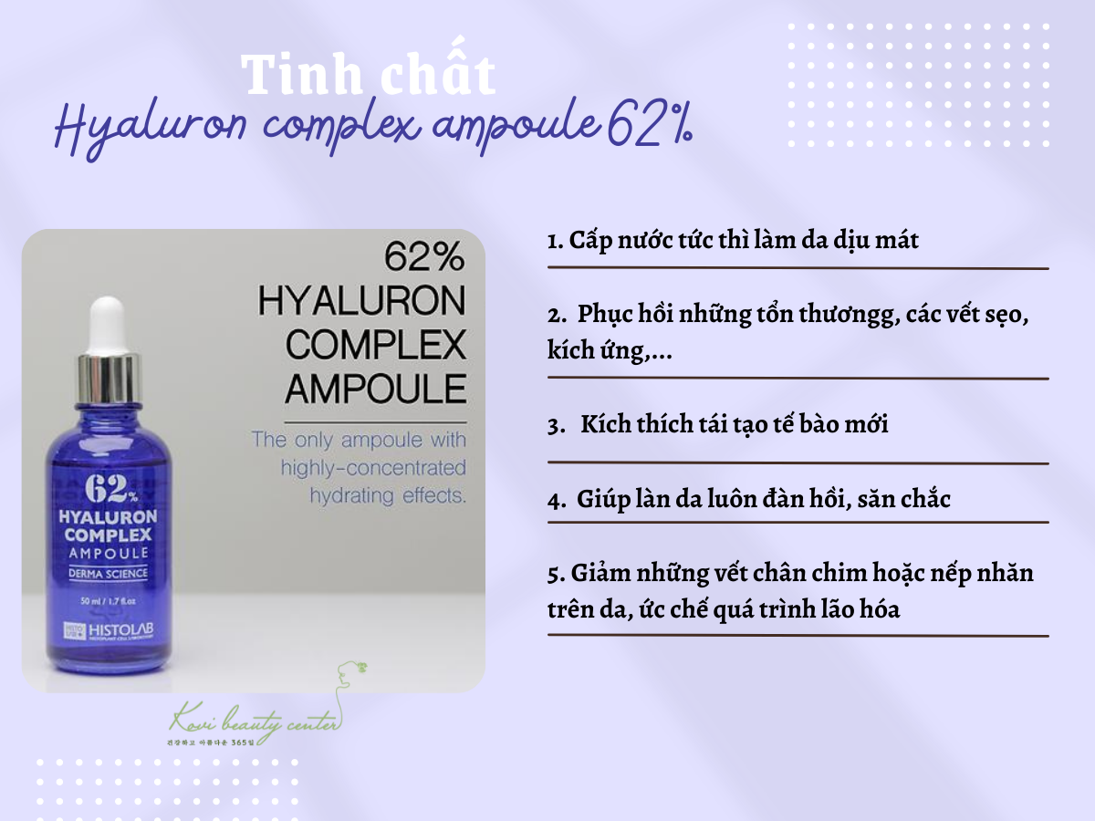 Sản phẩm 62% Hyaluron Complex Ampoule Derma Science với những thành phần từ tinh chất thiên nhiên đã rất nổi tiếng nhờ khả năng dưỡng ẩm, phục hồi da, chống lão hóa, mang đến cho làn da rất nhiều công dụng đa năng như: