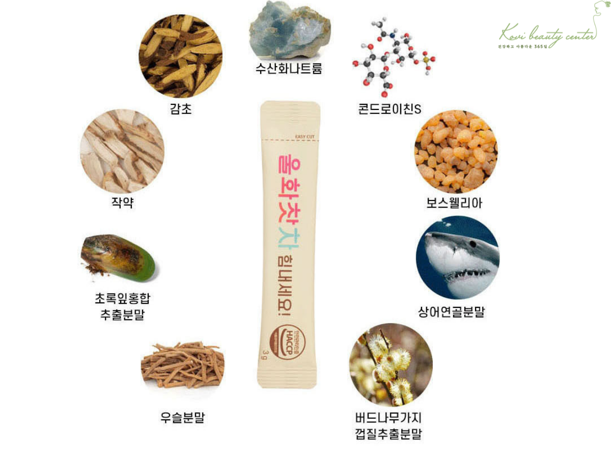 - Hoa trà, hoa mẫu đơn, cam thảo, chondroitin S, bột sụn vi cá mập, bột rau kinh giới, magie hydroxit, bột chiết xuất vẹm xanh, bột chiết xuất vỏ cành liễu,..