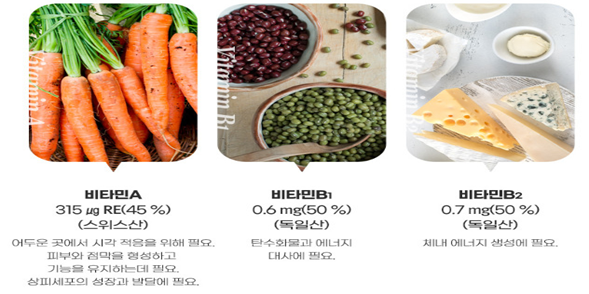 - Vitamin C, hỗn hợp vitamin E (DL-a-tocopherol axetat, tinh bột biến tính, dextrin, silicon dioxide), kẽm oxit, mangan sulfat, hỗn hợp vitamin A (dextrin, arabic gum, tinh bột bắp, vitamin A axetat, DL-a - Tocopherol ), hỗn hợp vitamin D3 {arabic gum, sucrose, dầu tinh bột bắp, dầu chế biến (dầu cọ), silicon dioxide, Vitamin D3, DL-a-tocopherol), hỗn hợp vitamin B12 (dextrin, trisodium citrate, axit xitric, vitamin B12), Vitamin B6, vitamin B1, vitamin B2, đường glucose tinh thể dạng bột, bột nước ép dâu tây( Hàn Quốc), bột dâu tây khô đông lạnh(Hàn Quốc), bột dầu hạt cải xylitol (Nhật Bản), bột cô đặc hỗn hợp rau củ, bột cô đặc hỗn hợp trái cây.
