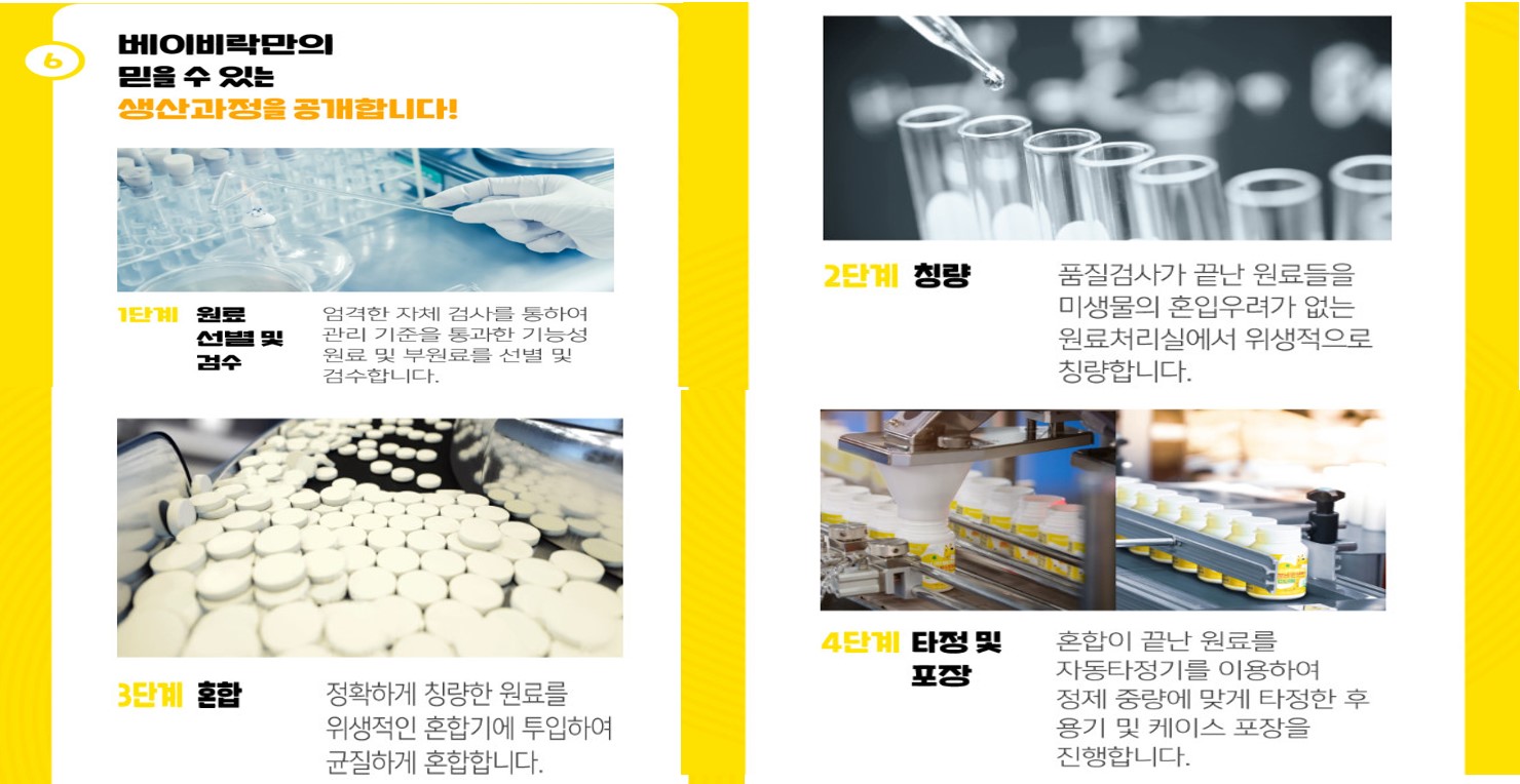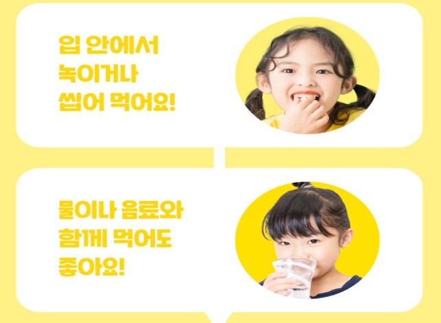 - Sự kết hợp giữa vitamin C và vitamin E, Kẽm Shinhwa, canxi pantothenate, hỗn hợp vitamin A, hỗn hợp vitamin D3, glucose kết tinh vitamin B2, Dsorbitol, xylitol, bột nước ép trái cây họ cam quýt (Hàn Quốc), bột hương cam (hương tổng hợp), magnesi stearat, axit citric, cellulose tinh thể, sucralose (chất làm ngọt tổng hợp), bột hỗn hợp vitamin-khoáng chất (bột rong biển, oxit magiê, vitamin E, vitamin C, kẽm Shinhwa, axit nicotinic amide, mangan sulfat, canxi pantothenate, vitamin B6, hydrochloride, vitamin B2, vitamin B1, hydrochloride, bột vitamin A, axit Folic, biotin, vitamin D3, vitamin B2) bột hỗn hợp axit amin, bột sữa non (sữa), sữa bột hỗn hợp vi khuẩn axit lactic