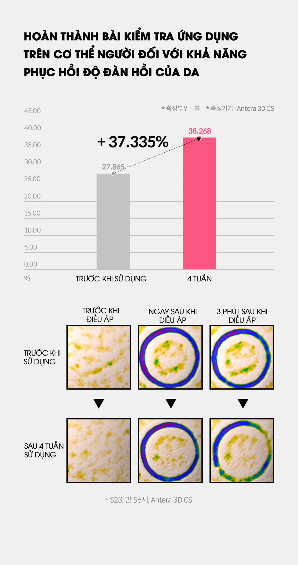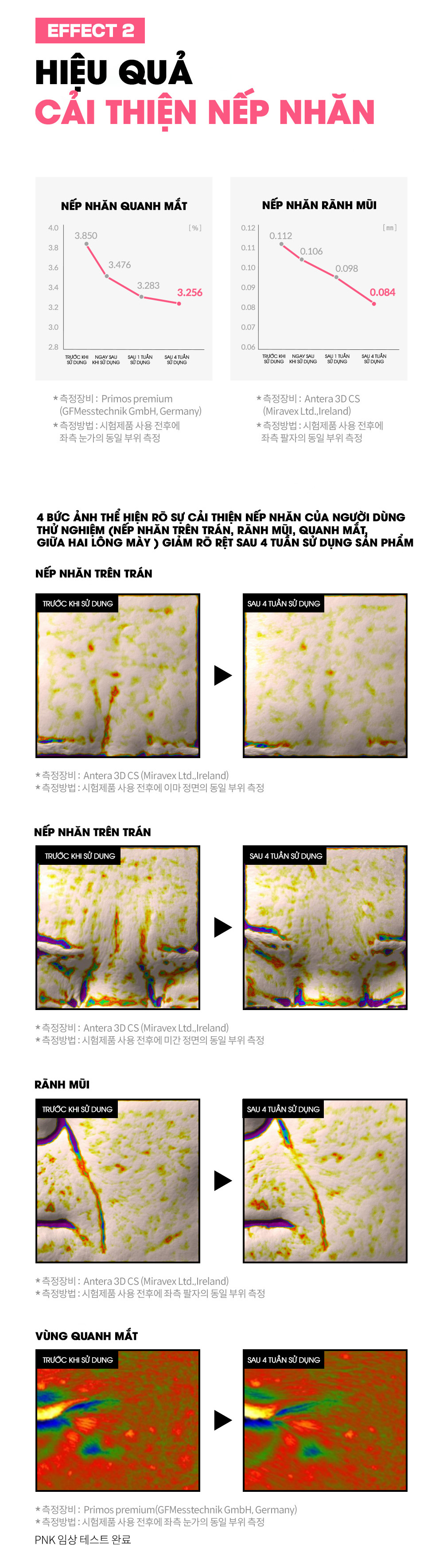 - Hiệu quả xóa nhăn rõ rệt với các nếp nhăn cứng đầu như nếp nhăn trên trán, nếp nhăn ở vùng cánh mũi và nếp nhăn vùng mắt chỉ sau 4 tuần sử dụng.